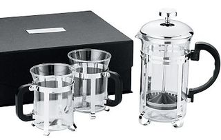 That being said, most French presses are glass. Forte Promotions recently sent me their Coffee House Cafe Set, consisting of a glass and silver metal 12-oz. French press and two matching 5-oz. glass mugs. They are sold in multiple units, with 24 being the minimum order.